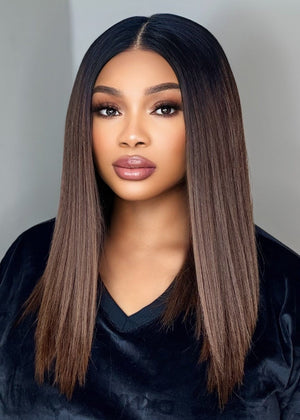 The rich Black to Chestnut Brown Ombre melts beautifully for a natural, dimensional glow — subtle but stunning. Featuring a 5x5 transparent lace closure, she gives a seamless scalp illusion with a clean centre part that stays flawless.